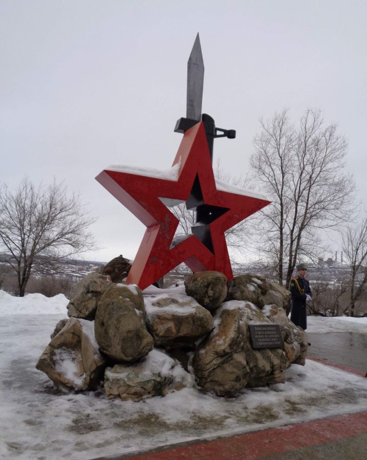 Минутой молчания присутствующие почтили память погибших воинов и возложили к Памятному знаку гирлянду, венки, алые гвоздики.